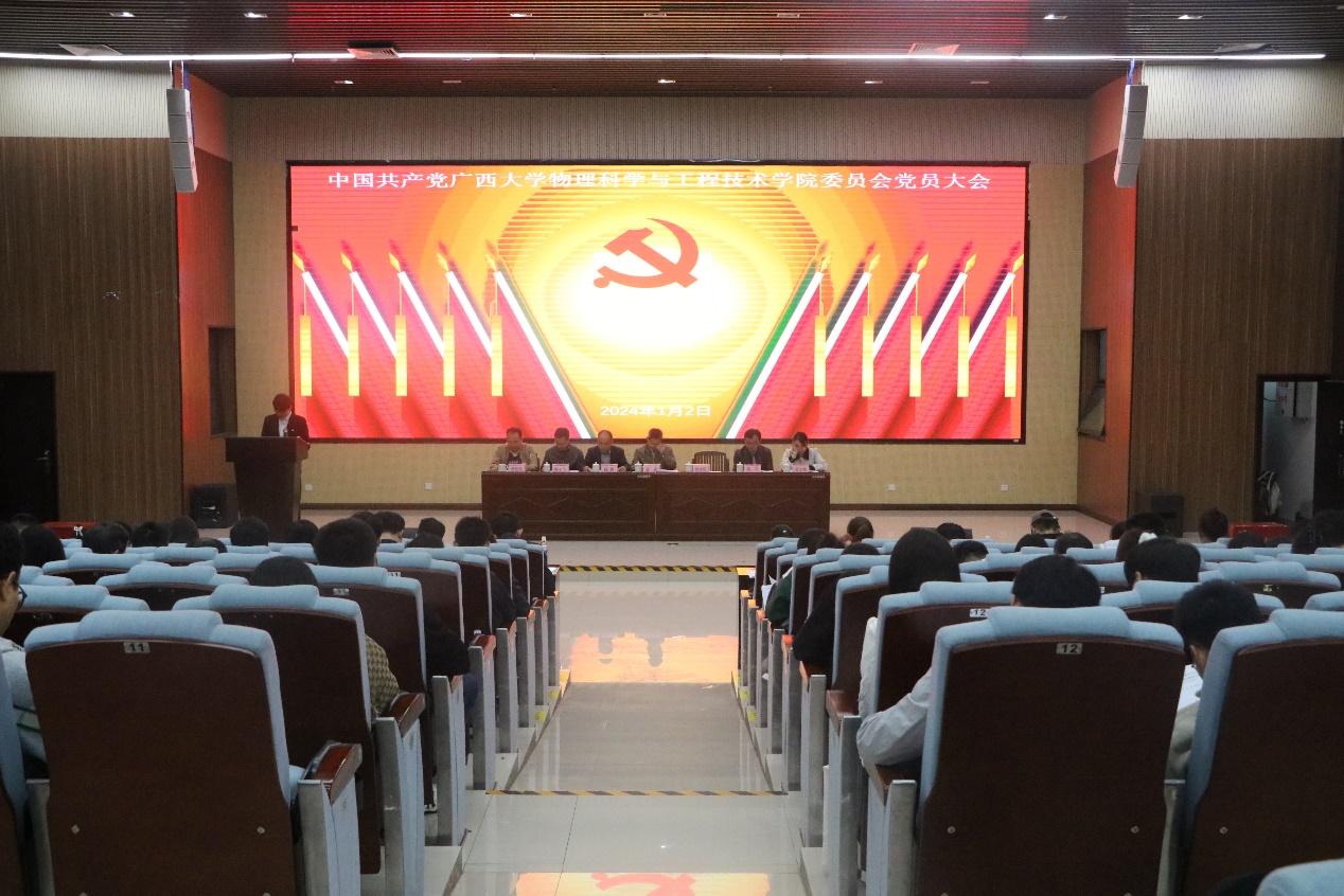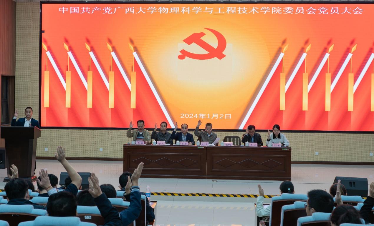 大会审议了中共太阳集团2007,太阳集团2007纪律检查委员会工作报告和党费收缴使用管理情况报告,并通过了中共太阳集团2007,太阳集团2007委员会工作报告、中共太阳集团2007,太阳集团2007纪律检查委员会工作报告、党费收缴使用管理情况报告、大会选举办法、总监票人、监票人建议名单。大会采用无记名投票方式和差额选举办法,选举产生了物理科学与工程技术学院新一届党的委员会和第一届纪律检查委员会。田植群、刘宏邦、陆翔、袁涛、梁恩维、梁毅、蒋津辉(按姓氏笔画排序)当选新一届党委委员,龙思宇、卢祖钾、徐守磊、曹盛、蒋津辉(按姓氏笔画排序)当选新一届纪委委员。