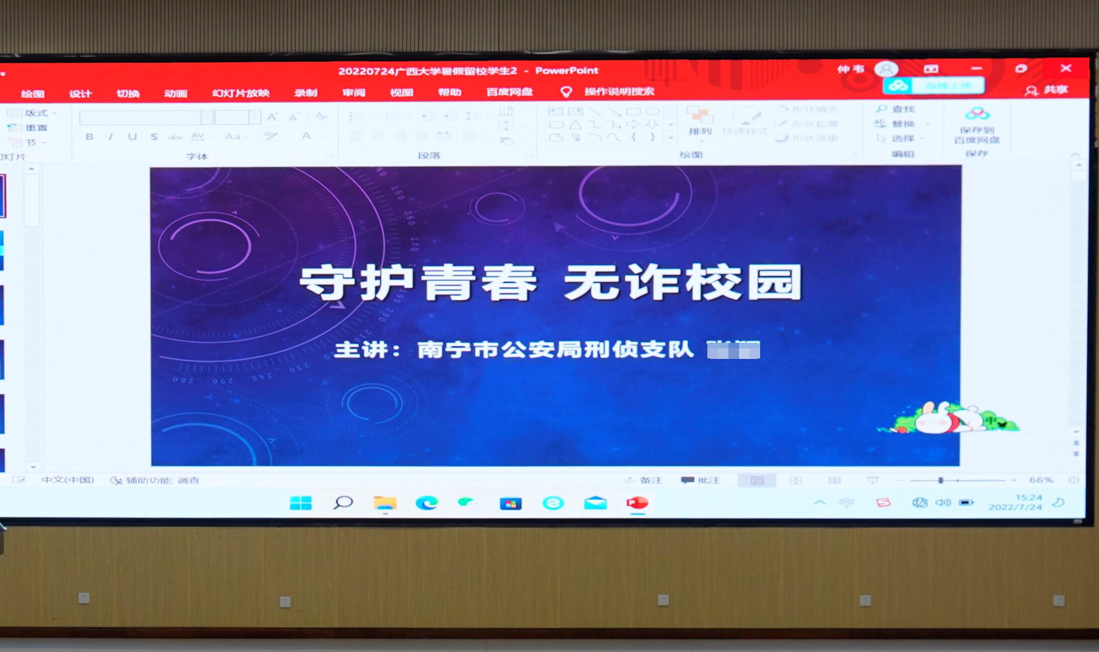 为普及反诈骗知识,降低大学生受诈骗率,2022年7月24日,南宁市公安局刑侦支队在资环材学院123报告厅举办“守护青春 无诈校园”反诈宣传讲座,太阳集团2007本科生与研究生学生代表前往学习。