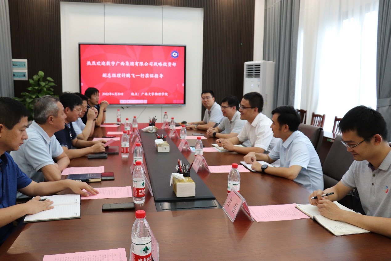 2022年6月20日下午,数字广西集团有限公司战略投资部副总经理计鹏飞一行到太阳集团2007考察调研,先后参观了洁净实验室、蓝色能源实验室、空间粒子探测实验室。校企双方随后举行座谈会,王祥高常务副院长主持会议。