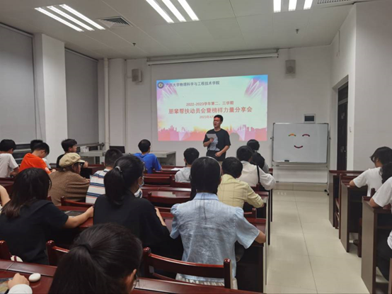在分享环节,上学期优秀帮扶者代表从前期准备、工作开展等多个方面介绍了帮扶的经验。参会同学就如何制定帮扶计划、如何安排帮扶时间和地点等问题与优秀帮扶者交流讨论。