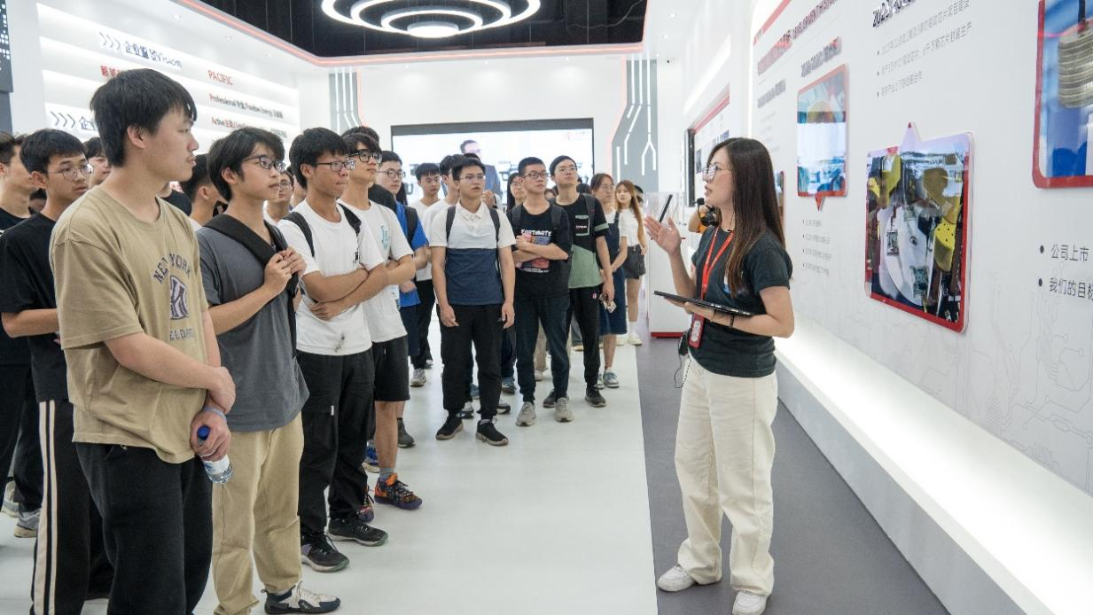 在参观环节,师生们首先来到华芯振邦的现代化展厅。这里展示了公司最新的半导体技术和创新产品,让学生们对集成电路的前沿技术有了更直观的认识。随后,师生们参观了公司的生产线,近距离观察了晶圆级凸块制造、芯片测试、封装等核心工艺的实际操作流程。