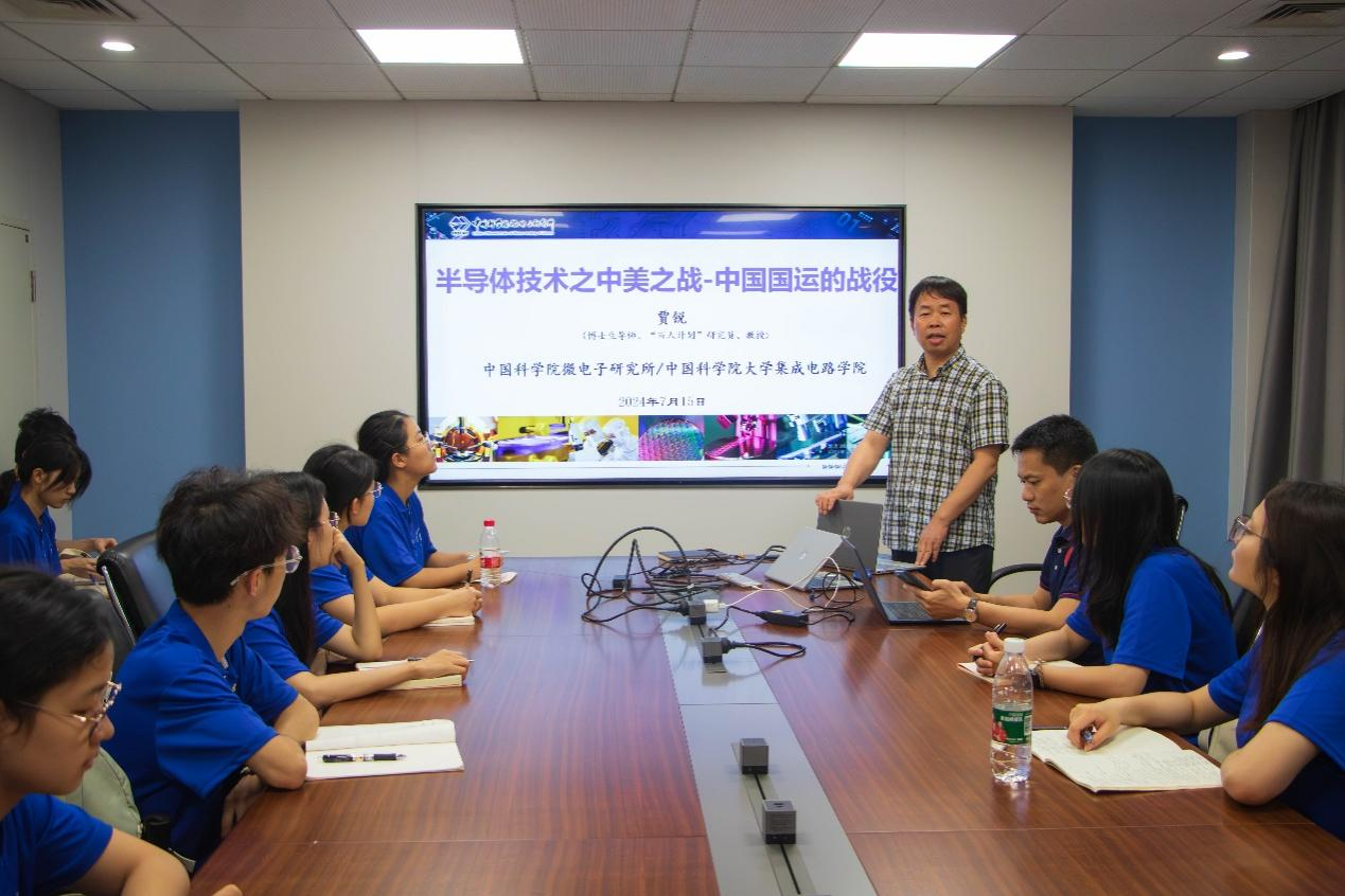 在中国科学院微电子研究所,由贾锐研究员为同学们开展关于半导体技术的学术报告。在这场报告中,同学们深入了解了半导体技术如何成为现代电子工业的基石,以及它在推动科技革新中的关键作用。随后,由微电子所的科研人员带领同学们参观集成半导体工业研发实验室。在这里,同学们亲眼见证了科研工作者们为研发新一代半导体产品所付出的努力与成果。
