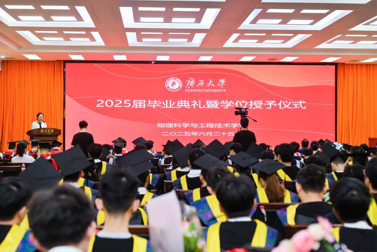 凤凰燃焰,荷影摇红。6月25日,物理科学与工程技术学院2025届学生毕业典礼暨学位授予仪式在君武馆玉林厅举行。院党委书记蒋津辉,副院长(主持行政日常工作)刘宏邦,副院长万玲玉、林达斌、黄创高,毕业生导师,毕业班班主任、家长代表以及全体2025届毕业生一同参加仪式,院党委副书记孙晓黎主持仪式。