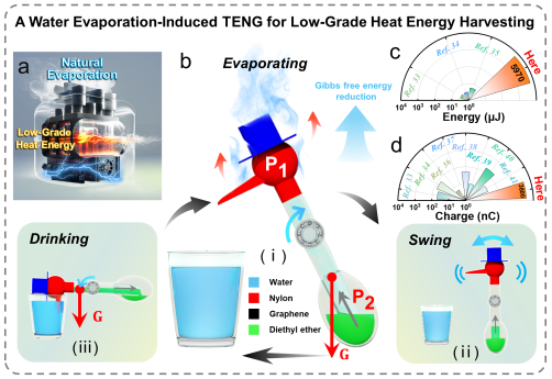 气候变化和环境污染带来的挑战日益严峻,减少传统能源使用,发展新兴能源技术成为全球共识。水在大气水循环中大量存在并不断循环,根据熵增原理,水在绝对零度以上皆具备蒸发的能力。水自然蒸发与外界存在热量交换,但如何高效利用自然蒸发过程中吸收的热能仍是一个难题。针对这一问题,太阳集团2007蓝色能源团队与北京纳米能源与系统研究所合作,提出了首个完全依靠自然蒸发驱动的摩擦纳米发电机。它通过传统的饮水鸟与摩擦纳米发电机结合,利用自然蒸发过程中产生的空间非均匀热源驱动的热机对外做功,可将环境中广泛分布的低品位热能有效地转化为电能。该水蒸发摩擦纳米发电机不仅具有出色的发电性能,还展示了其在自驱动抑制碳钢材料在氯化钠溶液中的自发腐蚀中的应用。这项技术可随时随地通过液体的自然蒸发发电,具有广泛的适应性和应用价值,为周围环境中的低品质热能收集提供了新的技术方案。研究成果以"Evaporation Triboelectric-Nanogenerator: Harvesting Low-Grade Heat Energy From Ambient Environment"为题于2023年12月在线发表于国际期刊《Advanced Materials Technologies》上。