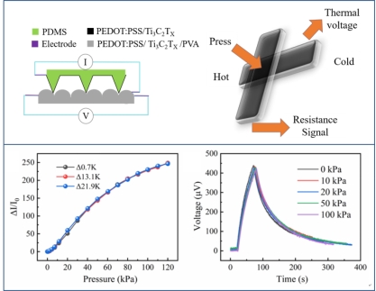 温度和压力传感是仿生电子皮肤的两个主要目标。大多数电子皮肤会通过应用不同传感原理(如电容-电阻原理)采集信号的方法来规避温度和压力信号的串扰。然而,这些传感器仍然存在灵敏度不足、无法很好解决信号相互干扰的问题。因此,该工作设计了一种具有仿生微结构的双层PEDOT:PSS/Ti3C2TX复合薄膜,利用电阻-热电原理分离两种传感信号的传输路径,并通过构筑微结构以克服压力和热两个物理参量之间的耦合,从而实现了完全独立的压力和温度传感。这种双模态传感器显示出稳健、可重复的响应,为仿生电子皮肤提出了一种可行的结构设计方案,在柔性电子领域具有较强的应用潜力。