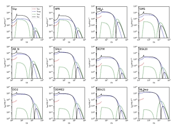 图2. 10 Mpc(上)和40 Mpc(下)处不同EOS的引力波应变随磁星频率的演变。