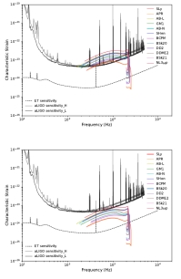 黑色虚线为ET的灵敏度极限,黑色和灰色实线分别为aLIGO-Hanford和aLIGO-Livingston的灵敏度极限。