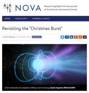 2021年12月9日,我2019级博士研究生邹乐及其合作者发表在国际权威杂志《天体物理快报》(The Astrophysical Journal Letters)上的论文被美国天文学会刊物研究亮点网站(AAS Nova)选为研究亮点,以“重温圣诞暴”(Revisiting the “Christmas Burst”)为题刊发了专题报道。