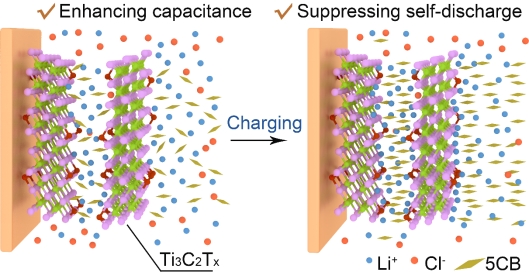 针对以上问题,太阳集团2007新能源团队提出将向列相液晶分子4-n-戊基-4′-对氰基苯(5CB)引入Ti3C2Tx薄膜和LiCl电解质中。复合膜电极充满电后,插层于Ti3C2Tx纳米片之间和溶解于电解质中的5CB分子,由于电流变效应方向会发生改变而垂直于纳米片,形成一个阻挡层,从而增加电解质的粘度,并抑制离子的交叉扩散/重分布和寄生法拉第反应。结果表明,所提出的方案可以有效抑制MXenes基超级电容器(SCs)的自放电,促进了MXenes基超级电容器在能量存储设备和集成电子器件中的应用。