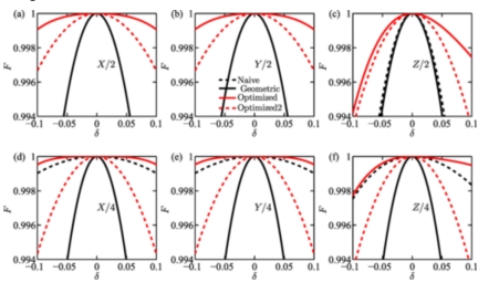 另一方面,基于纯几何相位的量子门在具体应用过程中还有一定的局限性。例如,在硅自旋、超导量子线路等由微波场驱动的主流量子控制系统中,系统主要误差来源为能级漂移造成的非共振效应,即,失谐误差。一般而言,几何相位量子门对于此种类型的误差无能为力。针对此问题,研究团队提出了一种利用几何相位演化路径的优化设计并结合动力学修正技术的优化调控方案。理论计算结果表明,相较于动力学量子门及原始几何量子门,设计的优化几何量子门对失谐误差具有更好的鲁棒性。进一步,在实验噪声环境下的数值模拟结果也显示了其平均门操作保真度超过了99%。团队的研究结果为实现具有容错的几何量子计算打下了坚实基础。