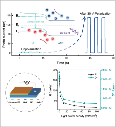 第三代宽带隙半导体GaN是制造紫外光电探测器的优秀候选材料之一,然而由于构建强内建电场以及抑制暗电流的技术难题,高性能GaN基自驱动紫外光电探测器仍然缺乏。太阳集团2007蓝色能源团队与西安电子科技大学彭彪林教授合作,提出了基于铁电材料调控的高性能自驱动紫外光电探测器。采用溶胶-凝胶法制备了n-GaN/Pb(Zr0.2Ti0.8)O3异质结,构建了一个由铁电性质调制增强的倒装式自驱动紫外光探测器。在30 V极化后,倒装式GaN/PZT/ITO通过增强的PZT退极化场(Edp)和GaN/PZT异质结的内置电场(EGaN/PZT)有效耦合作用,展现了出色的紫外光检测性能。在365 nm光照下,其光电流响应相较于未极化状态增大了40倍,最大光暗比(Ilight/Idark)达到了3.07×107,响应时间高达0.51/0.57 ms,响应率(R)和检测率(D*)分别为176 mA W−1和6.94×1013 jones。该策略为高性能GaN基自驱动紫外光电探测器的设计提供了一种简单可行的方案。