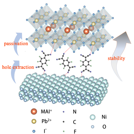 近年来,有机无机杂化钙钛矿由于其优异的光电性能而被充当各类器件的活性层。氧化镍,一种典型的p型半导体,是最有潜力的空穴传输层材料。然而,氧化镍/钙钛矿不良的界面接触限制了光电探测器的性能。在这项工作中,引入了2,3,5,6-四氟-7,7',8,8'-四氰二甲基对苯醌(F4-TCNQ)来修饰氧化镍/钙钛矿的界面以制备高性能的光电探测器。这项研究表明,F4-TCNQ层与氧化镍层和钙钛矿层存在着相互作用。一方面,它可以增加Ni3+/ Ni2+的比例,进而提高空穴提取和载流子的迁移率;另一方面,它可以形成一个新的路易斯加合物,钝化未配位的Pb2+离子。此外,经过F4-TCNQ修饰后,钙钛矿薄膜表现出良好的热稳定性和光稳定性。所制备的钙钛矿光电探测器展现出优异的光电性能。这项工作为进一步开发氧化镍/钙钛矿界面提供了一个简单而有效的方法。
