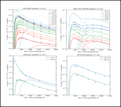 Ibn型超新星是相互作用超新星,其光谱具有由喷射物与富He星周介质相互作用产生的窄He I发射线。此前一些研究在IIn型和Ia-CSM型相互作用超新星中发现了尘埃形成的证据,观测到红外波段辐射超出。至今共有6颗Ibn型超新星同时具有光学与近红外测光观测,此前一个团队发现其中一颗具有尘埃,另一团队发现另一颗没有明显的尘埃形成的证据。还研究小组对另外4颗Ibn型超新星SN 2010alOGLE-2012-SN-006LSQ13dduSN 2015G的多时期能谱进行系统性的研究,发现OGLE-2012-SN-006的能谱相对于光球黑体辐射显示出明显的红外超出,SN 2010al的能谱显示出可能的红外超出,LSQ13dduSN 2015G的能谱未显示红外超出。假定红外超出为尘埃辐射所导致,利用超新星光球黑体与尘埃辐射的双成分模型很好地拟合了这四颗超新星的能谱(如图),得到了OGLE-2012-SN-006的尘埃的质量、温度与成分与另外三颗Ibn型超新星的尘埃的质量的上限值,进一步推导出尘埃所在位置的下限值,发现尘埃构成的壳层的半径远大于超新星喷射物的半径,从而证明OGLE-2012-SN-006的尘埃形成于超新星爆发之前,还比较了OGLE-2012-SN-006和其他被认为具有尘埃形成证据的相互作用超新星的尘埃的质量、温度、亮度、位置等性质。审稿人评价这项工作:“This paper presents an important study on the dust in Ibn supernovae……”“这篇论文给出了对Ibn型超新星的尘埃的重要研究……”)。