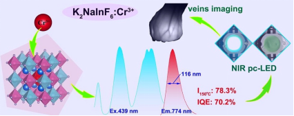 近红外光谱技术是一种无损、快速且方便的分析技术,在生物成像、食品质量评估和健康监测等方面有着广阔的应用前景,因此,开发性能优异的新一代宽带近红外发射光源具有重要的意义。本工作利用氟化物较低的声子能量和Cr3+在弱晶体场中易产生NIR宽带发射的特点,通过水热法合成了一种Cr3+掺杂的氟化物K2NaInF6:Cr3+高效宽带近红外发光材料,在439 nm蓝光激发下产生峰位在774 nm,FWHM为116 nm的NIR宽带发射,当温度升高到150°C时,发射强度仍保持在室温值的78.3%,表现出优异的抗热猝灭性能。优异的抗热猝灭性能归因于K2NaInF6:Cr3+中相对较弱的电子-声子耦合效应。此外,K2NaInF6:Cr3+表现出70.2%的高内量子效率(IQE)。考虑K2NaInF6:Cr3+的高效率和良好的热稳定性,基于NIR荧光粉和商用蓝光LED芯片制造了大功率NIR pc-LED,用该LED作为光源可以清晰地观察手指、手掌和手腕的静脉分布,表明其在生物医学成像方面的潜在应用。该工作一经报道便受到广泛关注,并接受专注于领域前沿进展的知名公众服务平台“Environmental Advances”的邀请撰写了文章解析,研究成果得到同行的肯定。