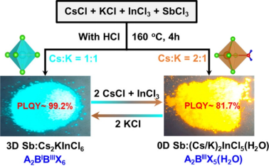 通过组分工程控制卤化物钙钛矿的结构,从而揭示晶体结构转换引起的发光性质变化是很有意义的一项研究。在此,我们报道了一种通过改变 Cs/K 进料比合成三维 (3D) Cs2KInCl6 和零维 (0D) (Cs/K)2InCl5(H2O) 卤化钙钛矿的策略。在 Cs/K 进料比为 1:1 时可获得具有3D结构的Cs2KInCl6 双钙钛矿,而在 Cs/K 进料比为 2:1 时则形成具有0D 结构的(Cs/K)2InCl5(H2O) 钙钛矿。进一步的金属盐前体添加可实现 3D Cs2KInCl6 双钙钛矿和 0D (Cs/K)2InCl5(H2O) 钙钛矿之间的可逆晶体结构转换。此外,合适的 Sb3+离子引入打破了禁带跃迁,大大提高了两种钙钛矿结构的发光效率。通过这种结构转换和Sb3+离子掺杂改性可获得一种新型的绿色/黄色可逆发射开关。同时,系统性揭示了钙钛矿结构与发光机制之间的关系。这些环境稳定的卤化物钙钛矿在光电器件中具有巨大的应用潜力。