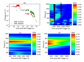 图一  GRB 180620A的光变曲线和时频分析揭示的准周期信号