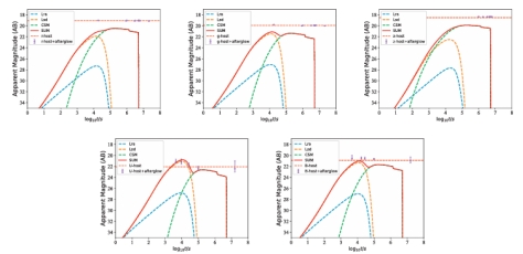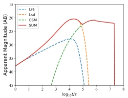 图1:r 波段光曲线,考虑了三种能量来源(r-process,旋转能和相互作用)的贡献;
