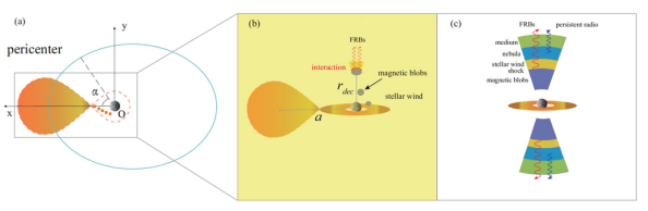 快速射电暴是发生在宇宙空间中的毫秒射电爆发现象,他们的物理起源至今仍然是一个谜。快速射电暴分为重复暴和非重复暴两类。论文提出了产生重复快速射电暴的新机制,即在包含一颗致密星(黑洞或者中子星)和一颗恒星的双星系统中,致密星吸积伴星物质产生相对论性的磁化喷流,喷流与伴星的星风发生相互作用产生磁化激波,磁化激波的波阵面中的电子群绕磁场运动发生同步脉泽辐射。这个过程产生的同步脉泽辐射频率正好在GHz附近,持续时间为毫秒量级,能量在1038erg左右,这与快速射电暴的观测特征完全相符合。此外,这个模型还可以自洽地解释在重复快速射电暴中呈现的频谱漂移,周期爆发,能量双峰分布,宿主星系和暴周环境的性质等一些列特征。