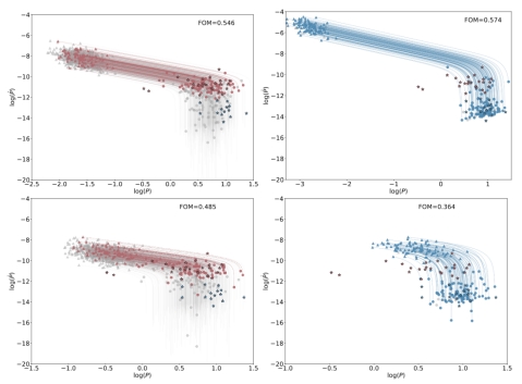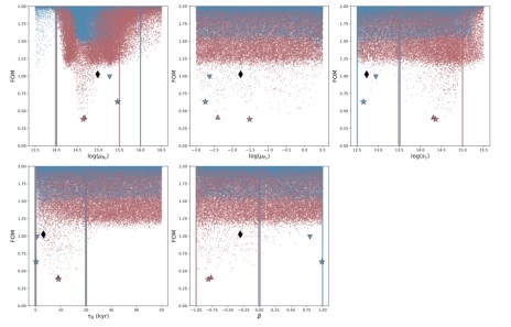 图2. 不考虑倾角演化的真空磁层中不同自由参数的FOM值。红点和蓝点分别表示用磁星的“高