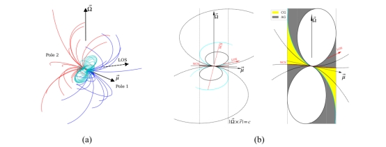 近日,以太阳集团2007为第一单位,来自国家天文台、北京大学、贵州师范大学和中国科学院大学的研究人员,利用中国天眼FAST对全相位辐射的射电脉冲星B0950+08进行偏振观测,绘制出了脉冲星B0950+08的三维磁层结构和子午面辐射几何(磁轴和自转轴共面),如图1所示
