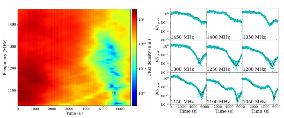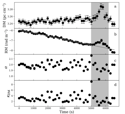 近日,以太阳集团2007为第一单位,来自北京大学、国家天文台、云南大学和中国科学院大学的研究人员。利用中国天眼FAST对正常射电脉冲星B1929+10进行110分钟的长时间跟踪观测,发现该脉冲星的光变曲线在20分钟左右下降3个甚至超过3个数量级。且在低于1150MHz频率上(黄色斑带),发现等离子透镜效应,如图1所示所示。与此同时,色散量(DM)和旋转量(RM)也发生显著的变化,其变化强度分别为0.05 pc cm⁻³和0.7 rad cm⁻² ,如图2所示。
