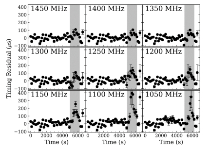 在光变曲线急剧变化时间段内,研究人员首次在观测上证实随频率演化的色散效应(chromatic DM),如图2(c)和(d)所示,参数α偏离2预示着辐射信号受随频率演化的色散效应的影响。研究人员还对该脉冲星信号进行测时分析,发现在光变曲线发现急剧变化期间,脉冲星辐射信号有明显的延迟,但色散增加效应却不能全部解释测时延迟,如图3所示。