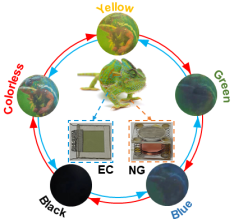 本系统的核心基于一种锌阳极电致变色装置(ZECD),采用非对称结构,集成了柔性氧化钨和氧化钒电极。电致变色过程中,氧化钨在蓝色和透明状态之间切换,实现近红外热调节;而氧化钒则在黄色和透明之间过渡。这种设计使系统能够在黑色、蓝色、绿色、黄色和透明之间进行非虹彩色彩转换,并提供可逆的近红外调制能力。为了实现系统的自给自足,研究团队设计了一种电磁与摩擦电混合式纳米发电机,可通过收集人体运动等生物机械能为系统提供动力。在典型驱动循环中,伪装系统不仅能够快速实现颜色转换,还能够显著调节近红外光谱,展现出对环境的高度适应性和优异的热调节性能。本研究为开发自适应、生物灵感的伪装系统奠定了技术基础,为未来在军事、可穿戴设备以及环境调节领域的应用提供了广阔前景。