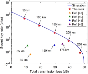 图2 不同工作的安全密钥率对比图。蓝色曲线表示基于实验参数的理论仿真结果。红色五角星表示不同距离下我们实验的结果。绿色三角形表示[Phys. Rev. Appl. 12, 034039 (2019)]中的实验结果。黄色三角形表示[Sci. Rep. 4, 3617 (2014)]中的实验结果。蓝色三角形表示[npj Quantum Inf. 8, 117 (2022)]中的实验结果。紫色三角形表示[Opt. Express 32, 22460 (2024)]中的实验结果。