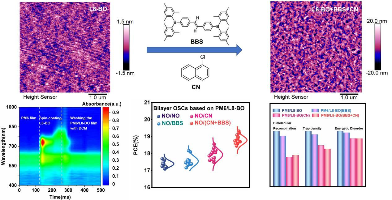 针对以上问题,太阳集团2007薄膜光伏研究团队使用“固-液混合添加剂”策略,有效调节双层结构中非富勒烯受体(NFAs)分子的堆积,从而改善NFAs分子的排列有序性。我们观察到,当L8-BO薄膜使用溶剂添加剂1-氯萘(CN)处理时,通过J-聚集增加了结晶度,从而实现了分子的边缘取向和纤维状网络结构。在将固体添加剂反式-双(二甲基苯基硼)苯乙烯(BBS)进一步加入L8-BO溶液后,其中BBS是一种具有多发射位点的荧光有机硼衍生物,它有助于L8-BO分子的紧密有序堆积,改善了薄膜的有序性,并形成了絮状结构。随后,与PM6配对通过顺序旋涂法制备了双层OSCs,以研究器件性能与形貌诱导的分子有序性之间的关系。结果显示,参考器件的PCE仅为17.70%,而加入CN后,性能提升至18.56%,这主要归因于填充因子(FF)的显著变化。进一步加入BBS,FF和短路电流密度(JSC)进一步增加,实现了19.32%的PCE,这是双层器件中最高的值之一。我们将器件性能的提升归因于减少的缺陷复合,从而提高了电荷提取和分离效率。而且,形貌的变化也引起了优异的性能稳定性,当1500h的储存时间后,仍然维持了初始效率的91%。这项研究的结果揭示了双添加剂对NFAs形貌的调制作用,对于实现高效的双层有机光伏电池影响深远。