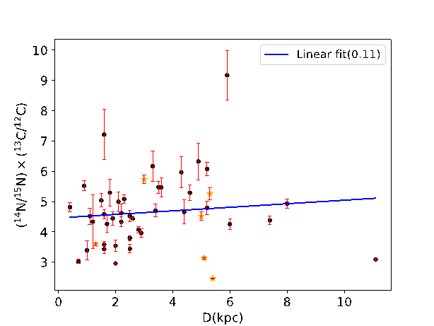 结果显示,(14N/15N)×(13C/12C)比值随着银心距的增加而呈现下降趋势,而与太阳距离则未观察到明显的趋势。同时,14N/15N比率呈现出随着银心距增加而增加的趋势。由于我们所测得的(14N/15N)×(13C/12C)比值相较前人具有小的误差,因此我们的结果能够有效约束银河化学演化模型,特别是在DGC小于6 kpc的区域,银河化学演化模型与观测结果差异较大,我们认为星系化学演化模型关于14N/15N部分需要进行更新。