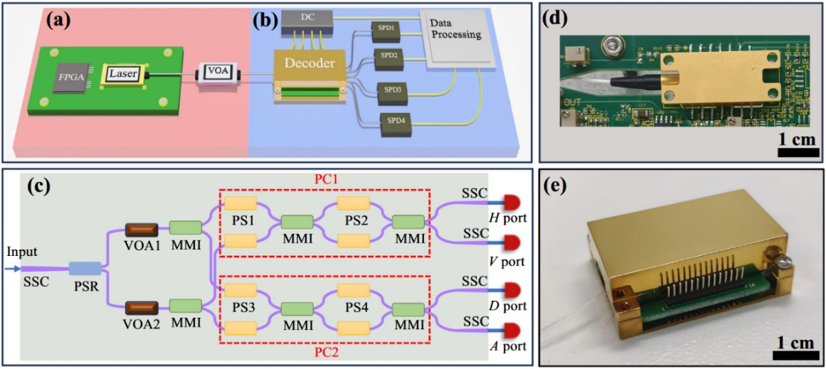 图1:硅基SI-QRNG系统。(a) 不可信随机源部分。Laser,半导体激光二极管;VOA,可变光衰减器。(b) 测量部分。Decoder, 硅基偏振态解码芯片; SPD,单光子探测器;Data processing,包括时间数字转换器和计算机;DC,可编程直流源。(c) 硅基偏振态解码芯片原理图。SSC,模斑转换器;PSR,偏振旋转分束器;MMI,多模干涉仪;PS,移相器; (d) 蝶形封装后的半导体激光器实物图;(e) 封装在控制板上的硅基偏振态解码器芯片实物图。