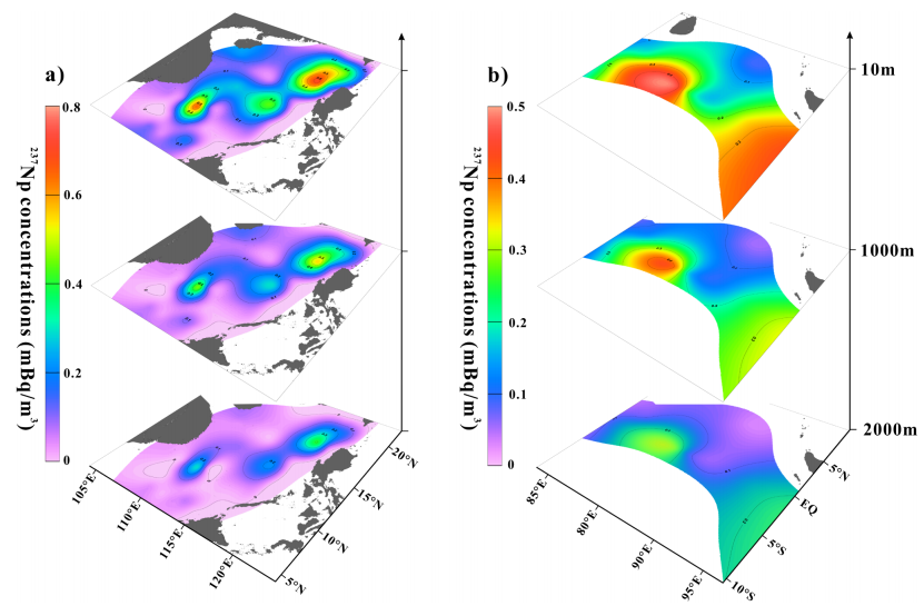 为了明确海洋环境中放射性核素的迁移特征及其来源,本研究采用ICP-MS技术测定了南海与印度洋沉积物中237Np与239+240Pu的活度,以及相应的237Np/239Pu和240Pu/239Pu原子比,以此作为示踪剂探讨从PPG到两大海域之间的传输路径。这是首次大规模报道南海沉积物中237Np活度及其237Np/239Pu原子比的分布,为评估Np在海洋中的迁移特性和去除特性奠定了基础。 在南海沉积物岩芯中,237Np的蓄积量与239+240Pu的范围分别为0.444~4.393 μBq/cm²和0.507~8.276 mBq/cm²,整体呈现由浅水区向深水区递减的趋势。通过对岩芯中237Np/239Pu与240Pu/239Pu原子比进行分析,可以得出结论:Np的迁移速率高于Pu,这一现象与两者的理化性质密切相关。此外,利用S-ADE模型对研究区域内海水中Np与Pu浓度进行了模拟,其水平分布模式类似于沉积物。然而,观察到Np浓度在垂直方向上自表层开始以指数形式递减,而 Pu浓度则呈单峰分布,其最大值出现在约500米处。这可能归因于二者溶解度差异以及沉积颗粒对它们吸附清除特性的不同。