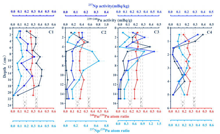 图1. 239+240Pu和237Np比活度的垂直分布,以及237Np/239Pu和240Pu/239Pu的原子比在岩芯中的垂直分布。