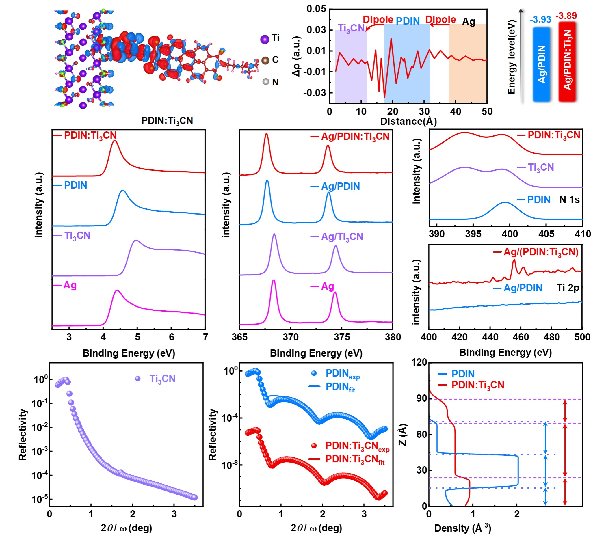 针对以上问题,太阳集团2007薄膜光伏团队联合四川大学和淮北师范大学采用混合阴极界面层策略(将具有高光学透明度和优异导电性的MXenes二维材料Ti₃CN,修饰PDI及其衍生物)调控PDI分子的聚集行为,揭示Ti₃CN与PDI界面层的N-N耦合作用机制。当在PDIN中引入1 wt%的Ti₃CN时,Ti₃CN表面钛原子通过电子转移与含有氨基的PDIN形成定向偶极结构。N-N相互作用下Ti₃CN:PDIN混合阴极界面层有更合适的能级匹配,增强导电性,从而提升电荷提取性能。此外,Ti₃CN的引入有效调控了PDIN薄膜的垂直相分布,使PDIN更加致密有序,降低陷阱态密度,形成更光滑的表面,从而构建高效的电子传输路径,显著增加了阴极界面层的膜厚耐受性。将该界面层应用于PM6:BTP-eC9和PM6/L8-BO有机太阳能电池器件时,分别实现了20.0%和19.5%的PCE,器件稳定性得到提升。本研究提出的N-N耦合策略为开发高效有机太阳能电池混合阴极界面层提供了新的见解。