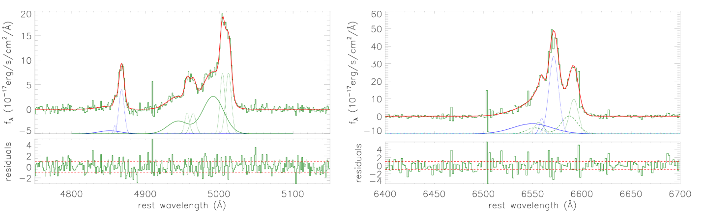 Fig. 1: On the best fitting results to the emission lines around Hβ (left panel) and Hα (right panel). In the left panel, solid dark green lines show the broad blue-shifted components in [OIII] doublet, solid blue line shows the determined broad blue-shifted component in Hβ. In the right panel, solid blue line shows the determined broad blue-shifted component in Hα.