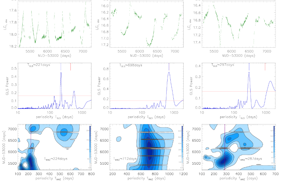 Fig. 1: Top panels show the artificial light curves created by dynamical model related to BBH systems. Middle panels show the results determined by the GLS periodogram. Bottom panels show the results determined by the WWZ technique. In each middle panel, vertical lines in blue and in red show the positions for the determined periodicity and the intrinsic periodicity.