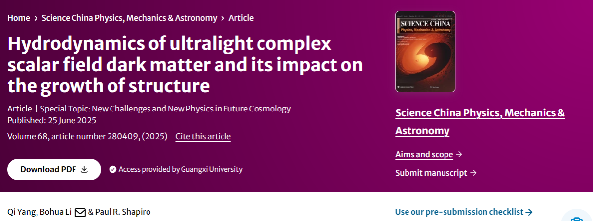 近日,我院宇宙学团队在暗物质研究领域取得新进展。研究结果以题目为“Hydrodynamics of ultralight complex scalar field dark matter and its impact on the growth of structure”的论文发表在中国科学院一区期刊Science China Physics, Mechanics & Astronomy (SCPMA)。论文的第一作者为太阳集团20072023级硕士研究生杨祺,通讯作者为太阳集团2007助理教授李博华。我校为论文的第一单位及唯一通讯单位。